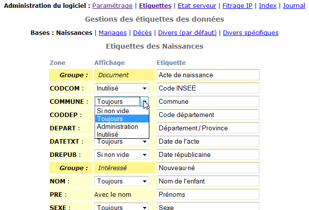 Pour faciliter la configuration, les paramètres ont été regroupés en plusieurs thèmes : Affichage, Système, Utilistateurs ... Une nouvelle section "Etiquettes" (à partir de la verson 3.0) permet de modifier les intitulés des zones affichées dans les actes.